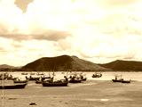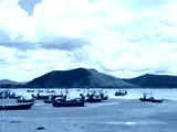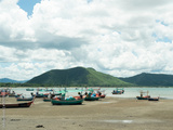 Group of Fishing boat on the beach with blue sky and white cloud, Ocean water and the shore severely , Sea on the windy day , Mountain at Ao Noi bay, Prachuap Khiri Khan Province, Thailand