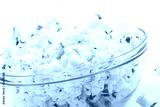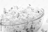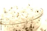 Closeup of glass bowl of popcorn with few peaces throw around.