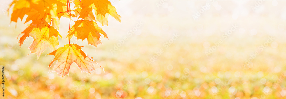 tender red orange transparent autumn maple leaves glowing at sunset banner. light flare tree with blurred background. Copy space golden fogliage seasonal backdrop