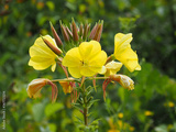 Yellow flowers and buds on an evening primrose plant, Oenothera biennis