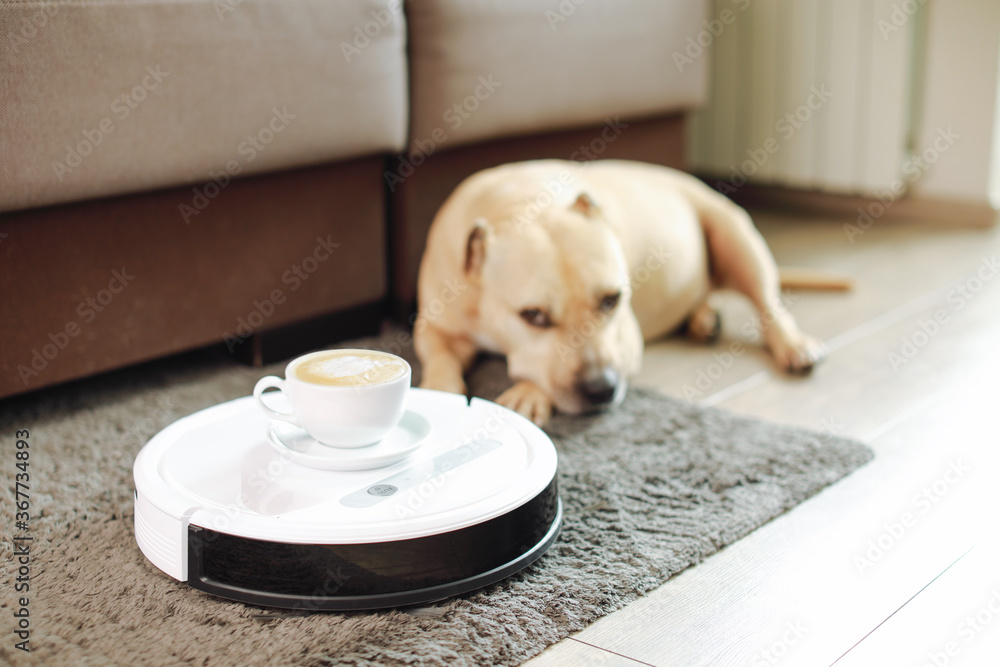 a dog lies near a working robot vacuum cleaner at home with cup of coffee on the top robot