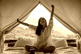 Portrait image of a young woman do stretching after waking up in the morning with a beautiful nature view outside the tent