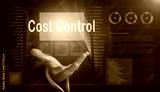 Businessman outreached hand holding a Cost Control business concept on a computerised screen display.