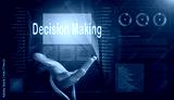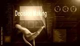 Businessman outreached hand holding a Decision Making business concept on a computerised screen display.