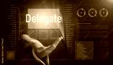 Businessman outreached hand holding a Delegate business concept on a computerised screen display.