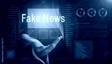 Businessman outreached hand holding a Fake News business concept on a computerised screen display.