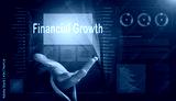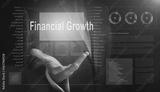 Businessman outreached hand holding a Financial Growth business concept on a computerised screen display.