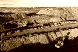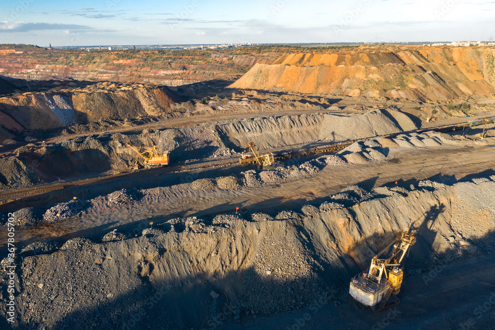 Quarry extracting iron ore with heavy trucks excavators diggers and locomotives aerial view.