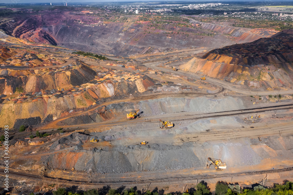 Open cast quarry for digging and production of flux limestone, gravel material, crushed stone and sand, aerial view. Mining industry.
