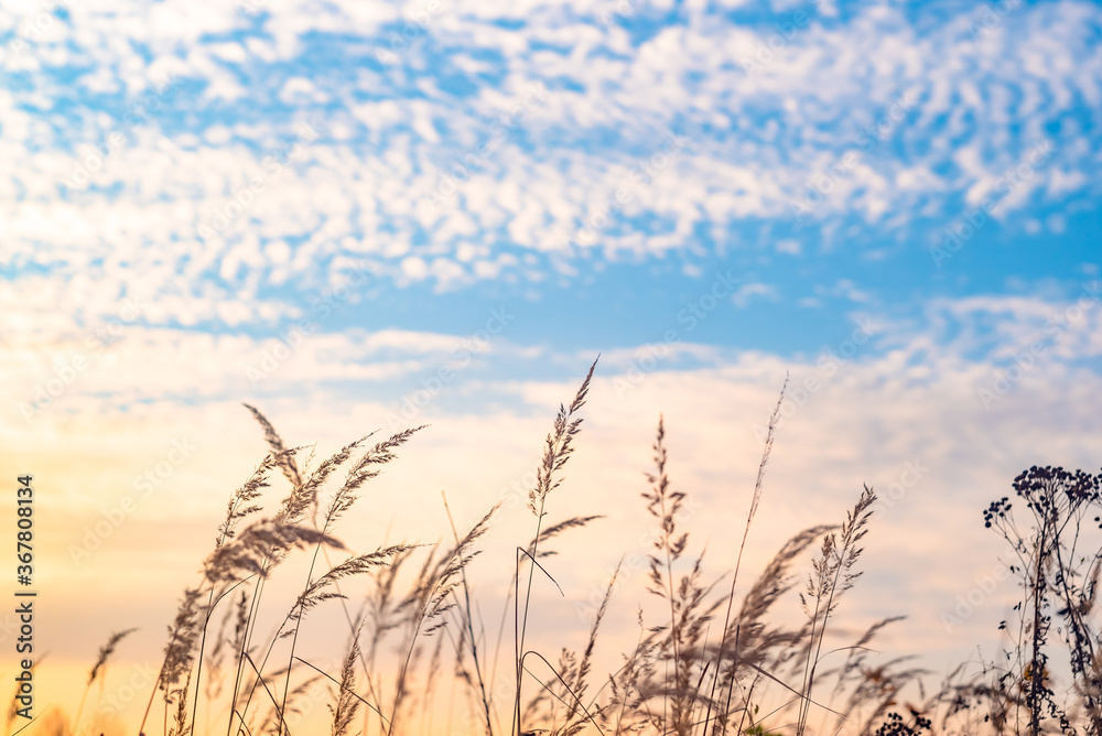 Tall grass and weeds overgrown in a field and a bright blue sky with white clouds. Silhouette of tallgrass bathed in sunset light