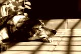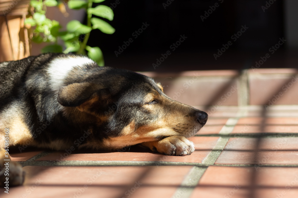 dog sleeping on the floor under morning sun
