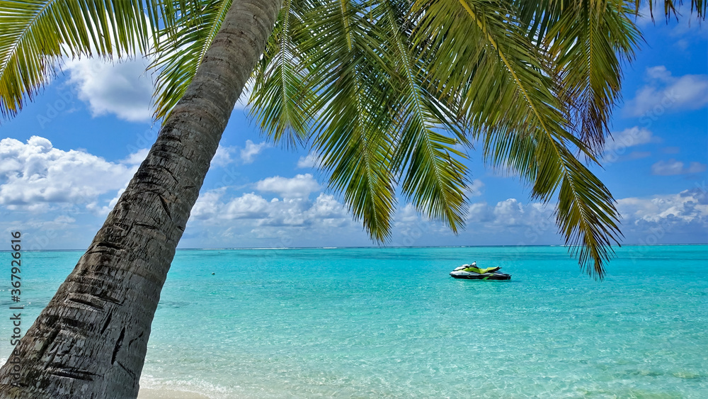 Paradise in the Maldives. A palm tree bent over the aquamarine ocean. Carved green leaves against the background of the blue sky and clouds. A boat is sailing on calm water. White sand on the shore.
