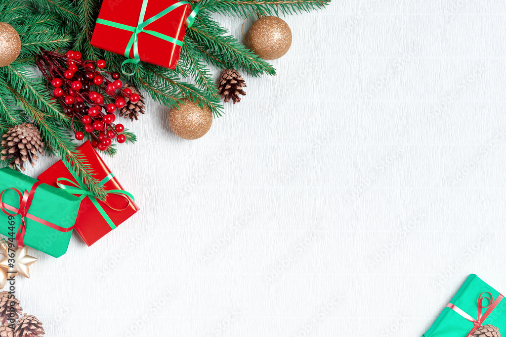 Christmas corner with green fir branches, decorations and Christmas gifts on a white background. Background for Christmas and new year cards with a branch of spruce and red berries.