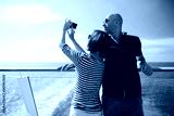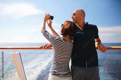 bald man and brunette woman traveling on cruise liner ship and taking pictures from smartphone on balcony