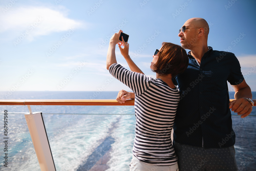 bald man and brunette woman traveling on cruise liner ship and taking pictures from smartphone on balcony