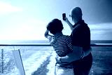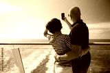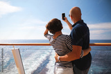 bald man and brunette woman traveling on cruise liner ship and taking pictures from smartphone on balcony