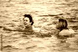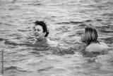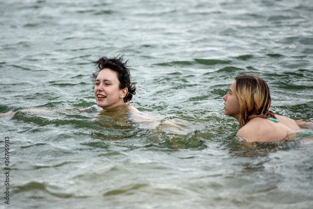 Two girls swim in the lake in the summer. The concept of a summer vacation.