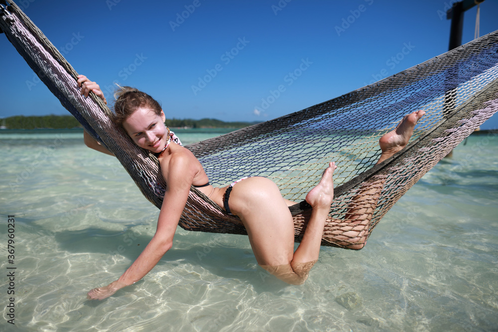 Beautiful caucasian woman with nice condition body relaxing in hammock above clear water in caribbean sea in Mexico summer time