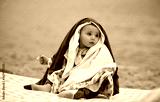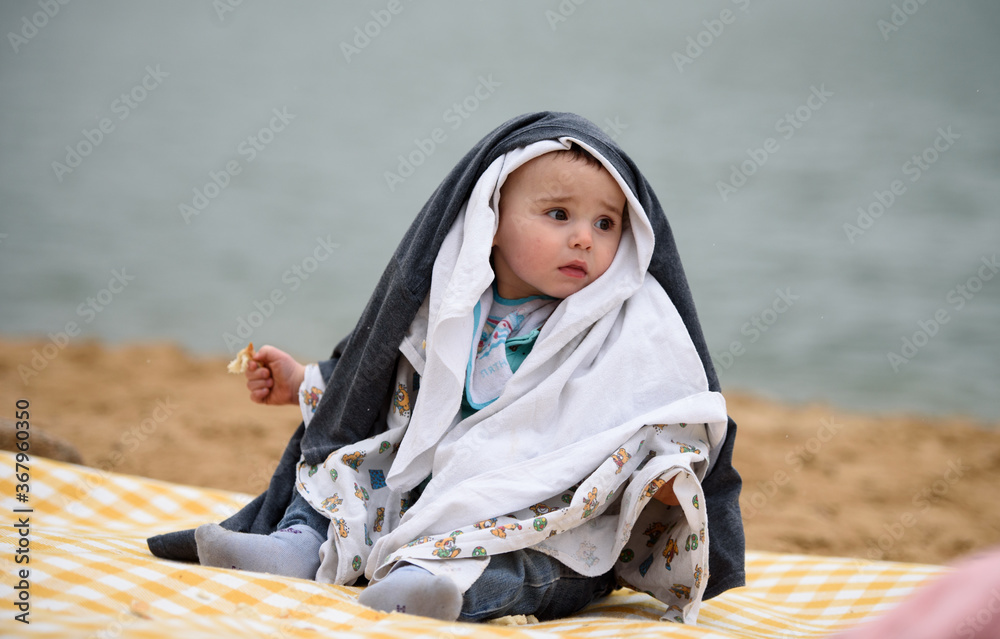 Portrait of a cute baby boy on the beach on a summer day wrapped up from the wind