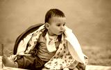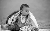 Portrait of a cute baby boy on the beach on a summer day wrapped up from the wind