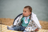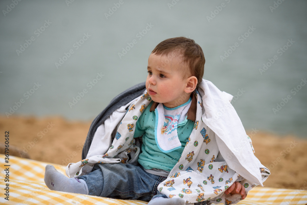 Portrait of a cute baby boy on the beach on a summer day wrapped up from the wind