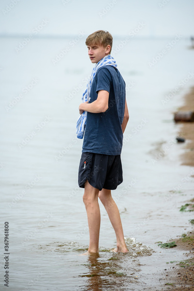tall boy on the beach is standing with his feet in the water