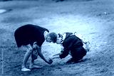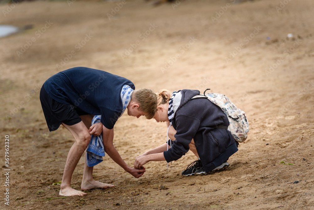 Guy and a teenage girl are collecting stones in the sand on the coast