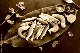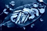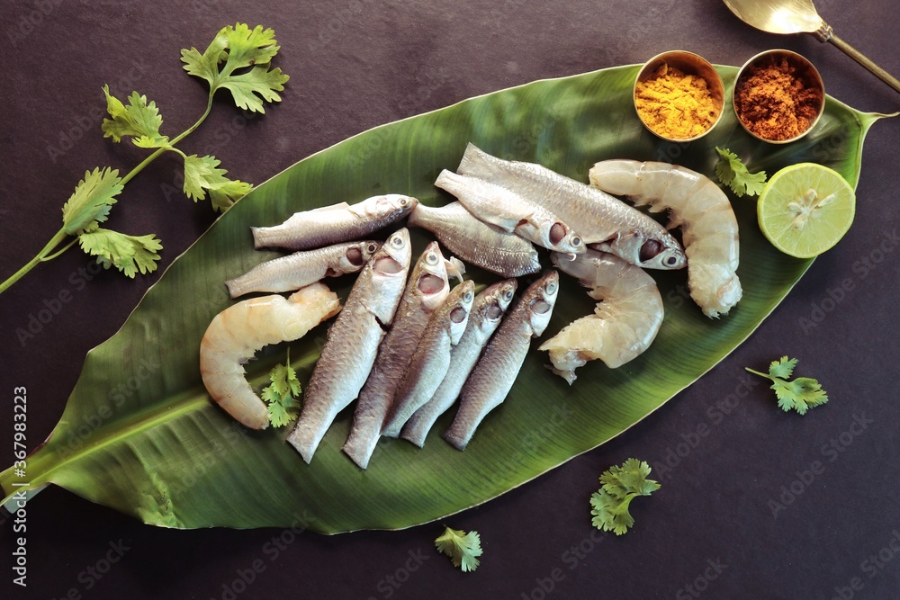 Indian White Mullet Fish or Boi Fish and prawns on a green banana leaf with Spices and cooking ingredients on black background, mix fresh cleaned raw fish, herbs, and spices. copy space.