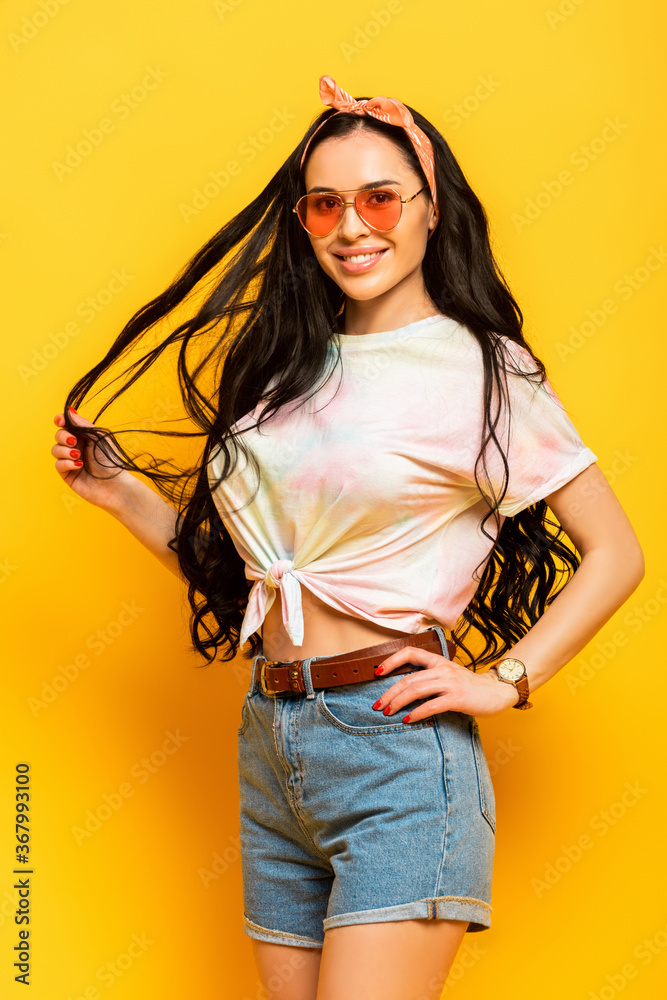 smiling stylish summer brunette girl with hand on hip on yellow background