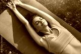 Healthy woman fitness mat doing warmup exercise. Fit woman lying on exercise mat stretching.