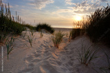 Zachód słońca ,plaża w Kołobrzegu,biały piasek,wydmy na wybrzeżu Morza Bałtyckiego.