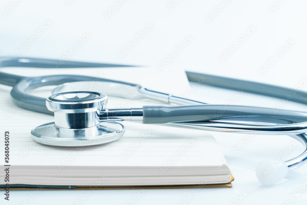 Medical stethoscope for doctor checkup and notepad on table