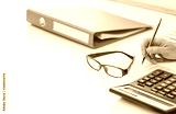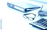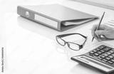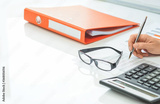 Finance and business. Financial office space with graphs. Paperwork binder and calculator, hand of a person working at desk with stats data. Cost revenue salary or small business. Copy space
