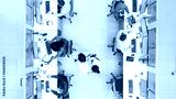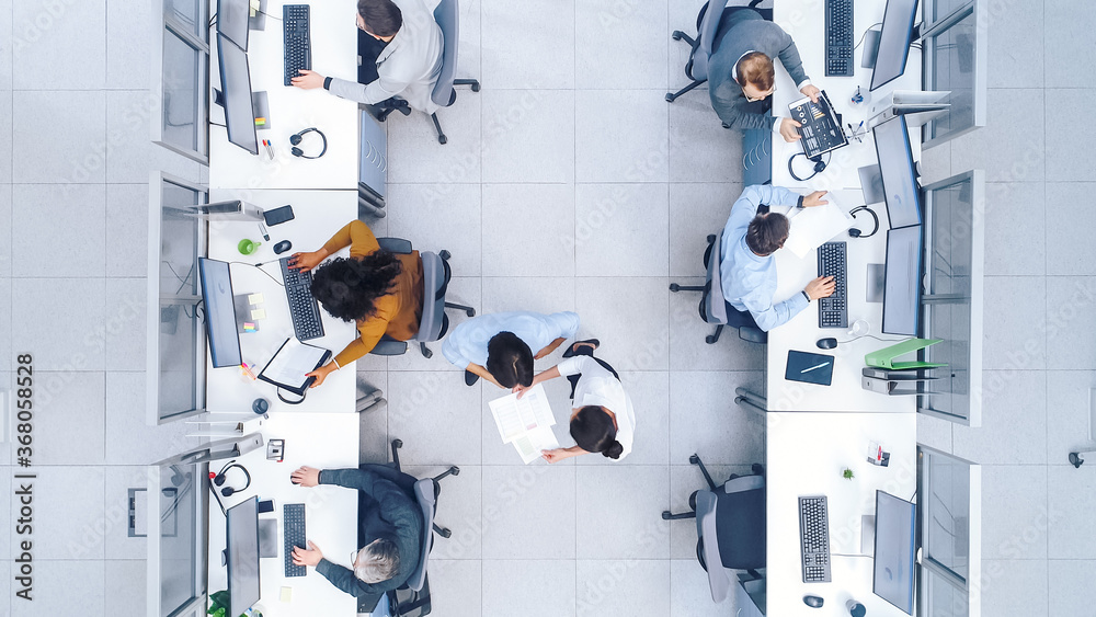 Top Down Shot of Big Busy Corporate Office with Tow Rows off Businessmen and Businesswomen Working on Desktop Computers. Bright Open Space Office with Businesspeople and Salespeople