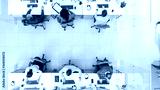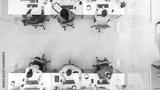Top Down Shot of Big Busy Corporate Office with Tow Rows off Businessmen and Businesswomen Working on Desktop Computers. Bright Open Space Office with Businesspeople and Salespeople
