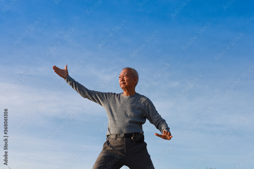 Asian Senior old man practice Taichi Chinese Kungfu on the beach