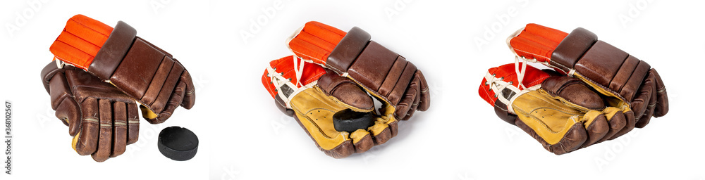 Set of Old red hockey gloves for goalkeeper. Isolated over white background