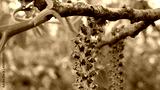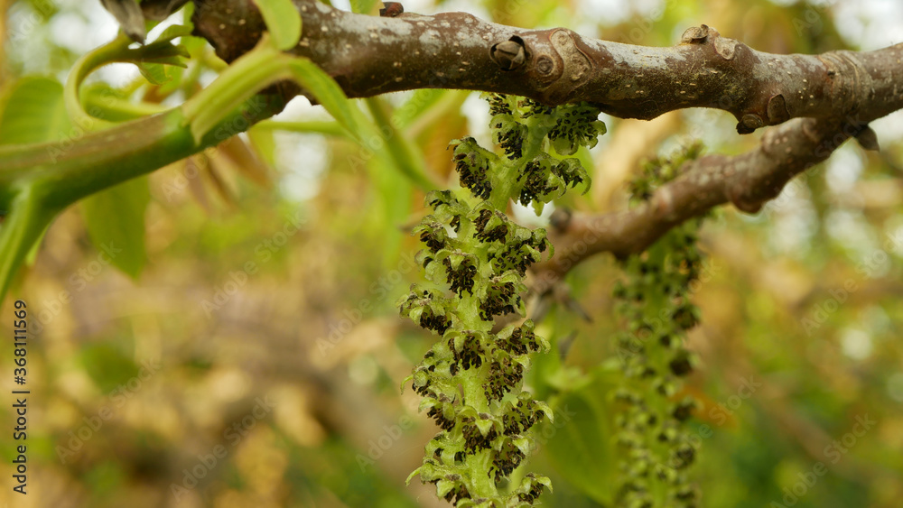 Walnut Juglans regia catkins flowers tree close-up macro detail blossom male spring green plant leaves leaf in garden farm farming agricultural. It bears dry nut walnuts. Bloom walnut, agriculture