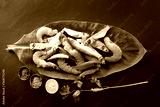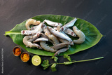 Indian White Mullet Fish or Boi Fish and prawns on green banana leaf with Spices and cooking ingredients on the black background, mix fresh cleaned raw fish, herbs and spices. copy space.