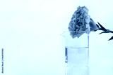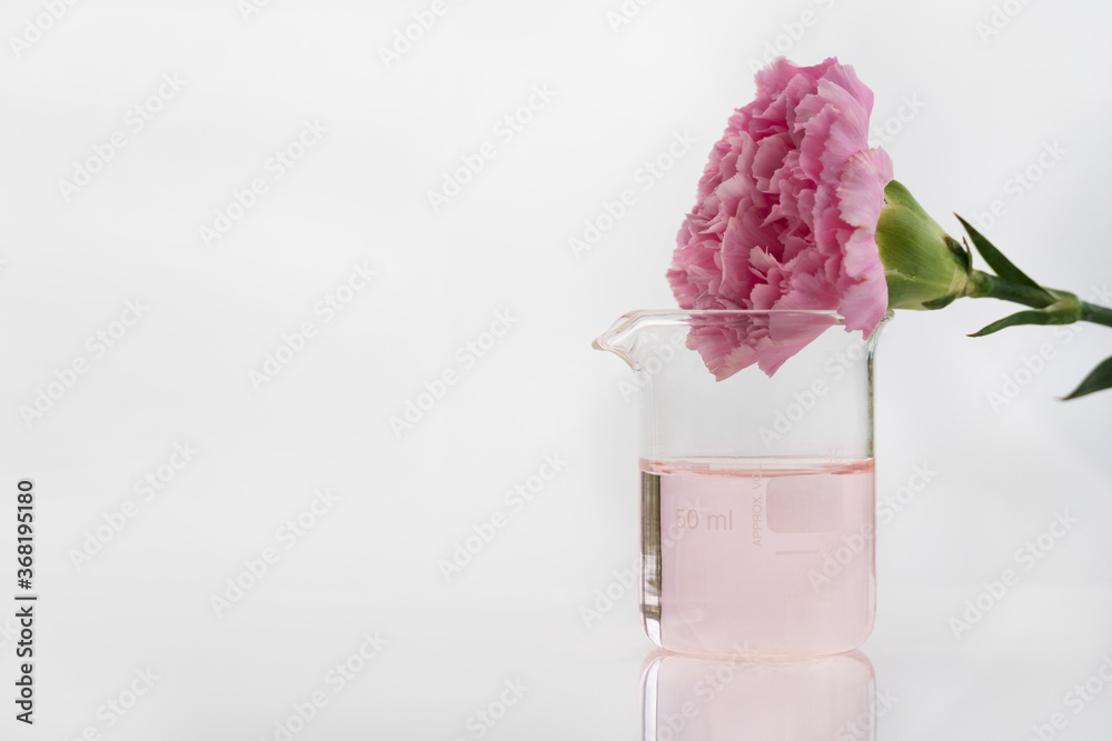 pink carnation natural flower with science beaker in white cosmetic laboratory background
