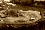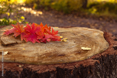 Red autumn leaves and berries on a stump, blurred forest background, falling and thanksgiving concept, selective focus