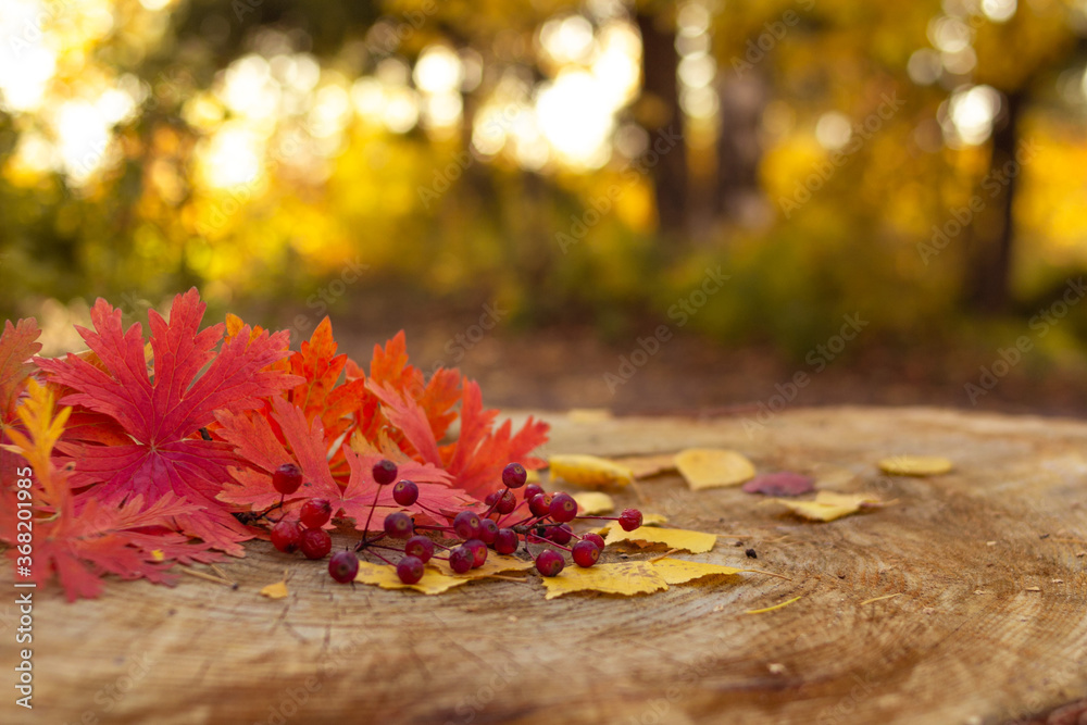 Red autumn leaves and berries on a stump, blurred forest background, falling and thanksgiving concept, selective focus