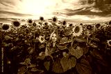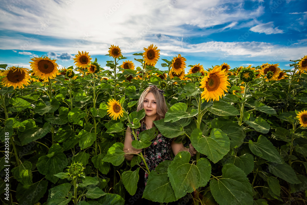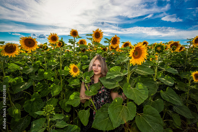 Beautiful young girl enjoying nature on the field of sunflowers at sunset