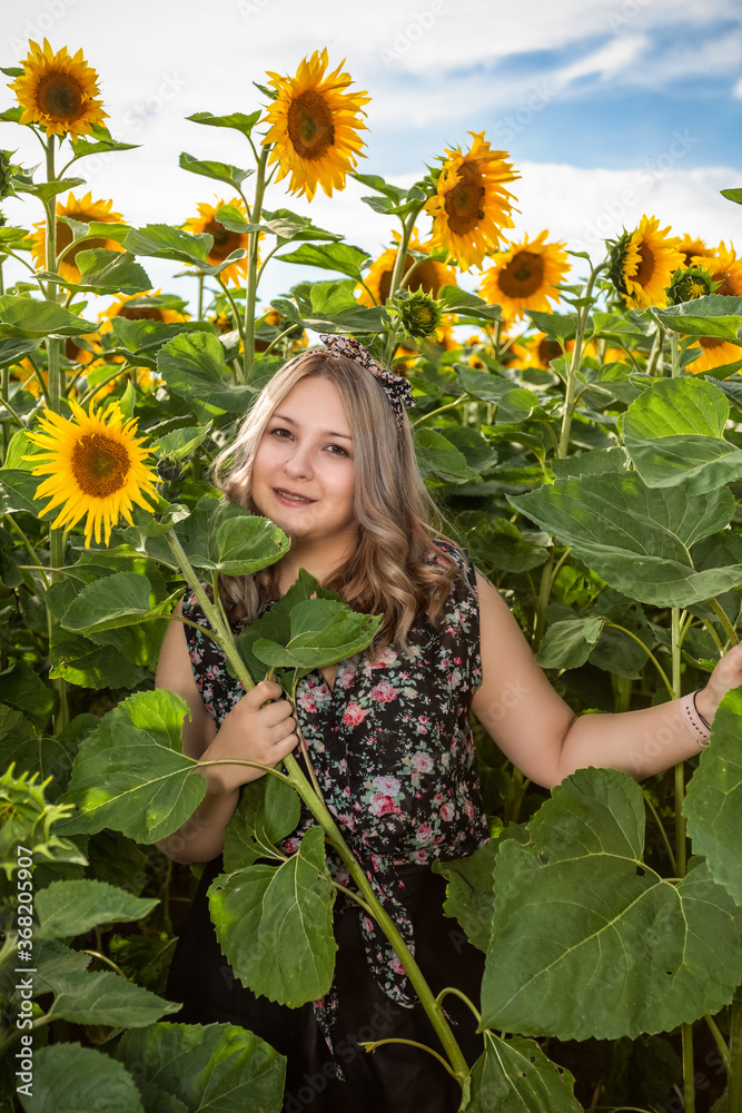 A happy, beautiful young girl is standing in a large field of sunflowers.