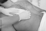 Cosmetologist doing waxing on torso of unrecognizable male client