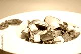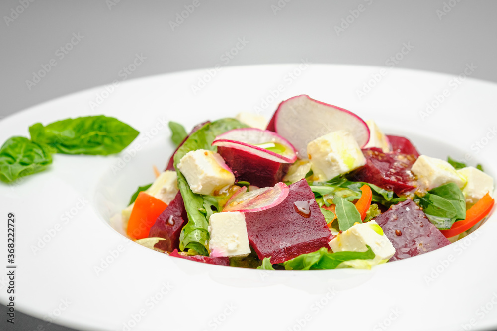 Vegetable salad with radish, soft cheese, beetroot and greens in a white plate on a gray background. Snacks on the restaurant.