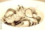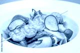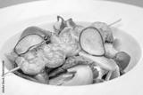 Grilled shrimp on a skewer with vegetables on a white plate on a gray background.