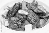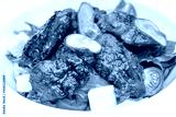 Grilled beef in a sauce with Dejon mustard and soft cheese in a case plate on a gray background.