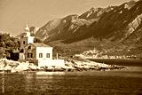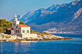 Lighthouse of Sucuraj on Hvar island and Biokovo mountain background view