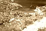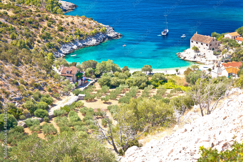 Idyllic beach in hidden cove of Dubovica on Hvar island aerial view